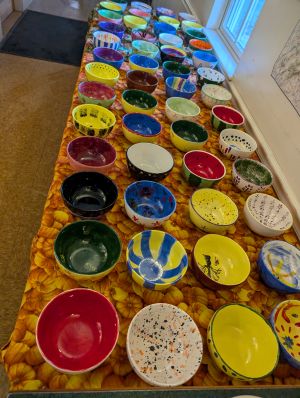 We planned Empty Bowls for months, buying the bowls and having painting parties all summer. We made good money for the food pantry and soup kitchen, but my personal goal was to bring back meals to the community center. It was great to see the room set up with the old tablecloths that I help to hem years ago, and to see people lingering to visit over their simple meal. We plan to do 4 community meals a year. Next project: get the story walk posts in the ground before it freezes.