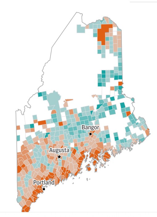 Question 1 on the ballot on Tuesday was about requiring an id to vote and restricting absentee voting days. It failed statewide 64 to 36. We are old in Maine and need all the absentee voting days we can get. It wasn't broken so it didn't need fixing. The results by town are fascinating; the numbers are a good measure of how liberal or conservative a town is and how educated and wealthy. It failed in Unity 56 to 43. Our results are always close. Across the lake from us in Burnham (trailers and junky yards), it passed 59 to 41. On the map red is liberal and aqua is conservative. The liberal parts of Maine are in the south and along the coast, but there are pockets of liberals in odd places like Madawaska Lake Township (79 voters) way up north that failed it 77 to 23 and Carabasset Valley (362 voters) in the west that failed it 75 to 24. Makes me want to visit those places and see who lives there. I can look up stats on their education and income levels to see how those correlate.