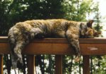 ![]() | And here is Delli (Delta Hat, which is a lower case delta with a caret over it, signifying a transition function in finite automata which are little logic machines, and that's kind of what a cat is, a weird piece of fuzzy logic that transits between states with the speed of a hallucination), our old sock monkey of a cat, kicking back on the deck rail. How old is this cat? Well, she was a kitten when we moved to Lacombe from N.O. and we lived in Lacombe 13 years. |