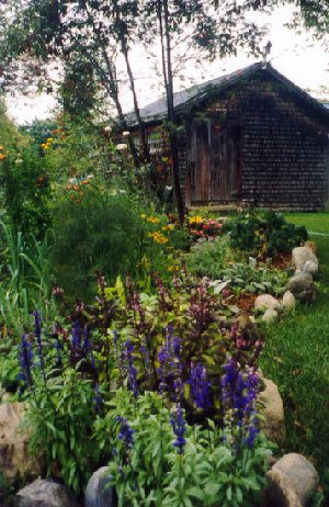 Melissa and I have been fixin & doin in the garden at the Heron. Behind this garden shed is an open space just right for say a volleyball court. But right now there is a large tent there and tomorrow Melissa will have a reception for about 40 Rotary people. Rotary people are folks who know how to rotate; sometimes also skilled at pivoting. This is a pre-dinner thing with horse ovaries and drinks; then they'll all wander over to the Homestead for dinner. Dinner with speeches is cruel and unusual boredom, so I've opted for clean up committee. I have to go the the reception thingy so I can take pictures and make fun of them next week. Documentation. It's hard work but someone's got to do it. | |