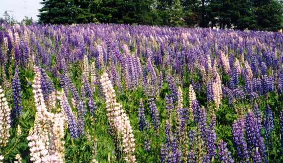 | Last Monday was the solstice (and the Times-PicayUnity's one-year anniversary--jeez, I've been doing this for a year). We had no guests Sunday night, so we took a one night away adventure, drove downeast to Jonesport, stayed in a tourist cabin in Jonesboro, wandered up to Campabello, the summer cottage (18 bedrooms) of FDR and Eleanor Roosevelt. It's just over the border in New Brunswick. Hiked around Quoddy Point, the easternmost place in the U.S. The trails go along cliffs over the ocean. And on the way, in Harrington, I walked through the biggest field of lupin I've ever seen. There was a sharp clean floral smell in the middle of that field. Ate fried haddock in restaurants unchanged since the fifties. Ocean air is cool and fresh, and the light is different.