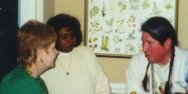 | One of the smartest things we did was to open on Mardi Gras of last year. This way we get to have an anniversary party every year on Mardi Gras. Craig got the baby in the King Cake and told his mama to start cooking cause they had to give the next party. My sister Colleen and 7 of her friends escaped to Maine over the holiday. The town is still talking about them. In a moment of Diversity in Unity Helaine and Betty from N.O. chat with Phil, better known as "the big indian." | |