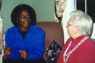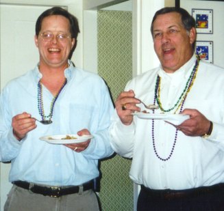 Jody and Bill are wearing their beads and eating jambalaya (Sue, you can come back and cook anytime). Jody told us later that if "all those women ever came back to town, he wanted to know about it right away." Another friend, Victor, toured them around the college. Lisa from Philadelphia chats it up with a friend of Melissa's mom.