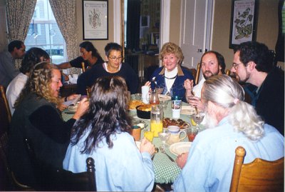 | Here's the crew that was with us for Commonground Fair. Everybody re-upped for next year, so we don't have to break in anyone new. Kinda crowded. We hope to have a table made this winter that will seat 12. Up in the attic of the Heron there are a lot of wide hemlock boards that are apparently the same age as the house (built 1842). We hope to have a long table made from some of them.