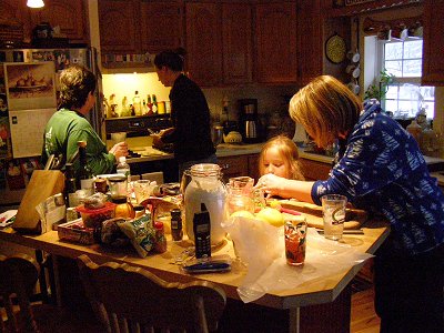 As of the 7:04 am solstice moment, it's officialy winter and it's coming in as a foot and a half of snow. On this snowy afternoon, Melissa, Jayne, Reilly,and Jennifer were elving in the kitchen, cranking out a gazillion cookies while watching Polar Express twice.