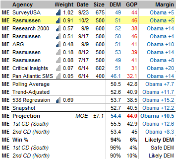 There's not as big a discrepancy here. ME-2, which stretches from Bangor into Maine's northwoods, is the inferior district for Obama, but probably shouldn't run more than about 2-3 points behind his statewide totals. Obama dominated McCain in fundraising in both ME-1 and ME-2, and while ME-2 does present some demographic challenges for him -- there are some of Ed Muskie's "Cannocks" up that way -- it also has a higher percentage of young voters than ME-1, which should help Obama somewhat.
