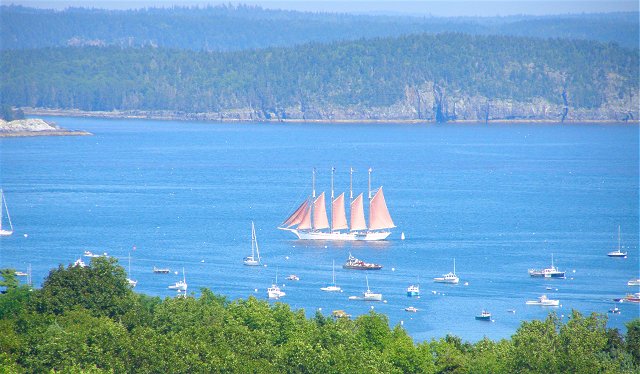 As we were driving out of Acadia yesterday, this schooner was sailing in the harbor, looking ghostly in the slight haze. We were returning from Melissa's birthday lunch at Jordan Pond House. Popovers, yes. Julia is going off to Smith in a couple of weeks. We had to report on our impressions of Northampton and the campus. Before lunch we met Marge and Miff at Thuya Garden in Northeast Harbor. The temperature drops about 5 degrees when you drive up the densely shades road leading to it.
