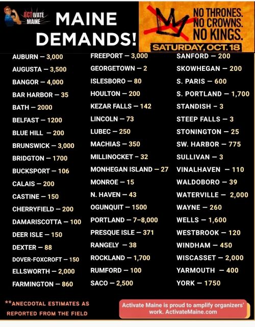 It is a good sign that the No Kings protests keep growing in size, from two million to 5 million and the last one to 7 million. Nationally, 12 million would reach the 3.5 Chenoweth threshold, but Maine has reached it already. Love to see the small town counts.