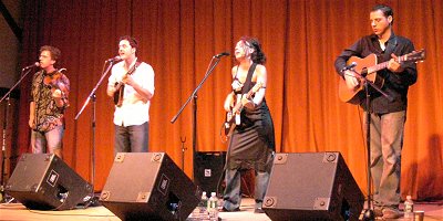 At Newport last weekend wandering around, I heard strains of Alejandro Escovedo from the main stage and thought "spectral apocalyptica, punk sinatra, satiric retro orchestral". Later sitting center eight rows back in the Harbor stage tent I felt that my ears should be flying back like the dog in that speakers ad from the power of the music. Two cellos, two guitars and a violin made up the band and those churning cellos cranked up an emotional intensity into which his spare lyrics fit like prophecy. I knew I was hearing one of the great ones. We also heard great sets by Rani Arbo, Amos Lee, the John Butler Trio, and the North Mississippi Allstars. The big acts (Allman Brothers, EmmyLou, Allison Krauss) seem like museum pieces to me; Derek Trucks seemed confined in that old setting; I prefer seeing him stretching out to world music and jazz. A Jerry Douglas solo on dobro was the best thing about Allison Krauss.