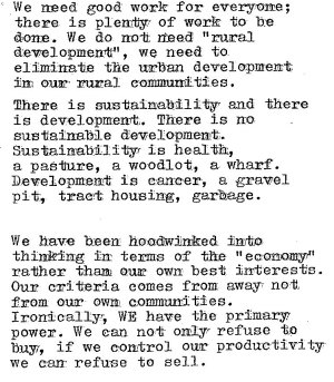 They define themselves as "a pressure group of armed, concerned, rural citizens." Except for the "armed" and secretive part, they touch on some values commonly held around here. And that no-website message on the back of the brochure is a final brilliant touch in that xfiles paranoia kind of way. So what do you think? A creepy militant group or someone's final project in a marketing class?