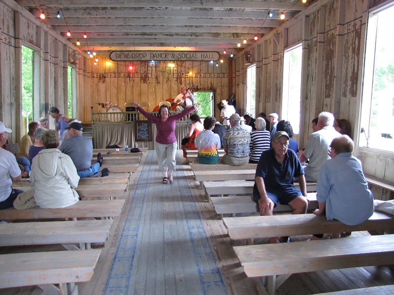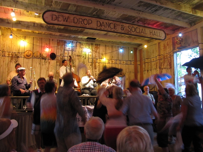Yesterday was all about the Dew Drop, a small venue that was resurrected when our pal Jinx donated the old building to the town. For the 13th year a group of Brittish jazz fans gathered there to hear awesome clarinetist Dr. Michael White. Gregg Stafford on trumpet was great and Don Vappie played bass. The venue itself was the charmer. Big open windows as a light rain fell. That's our friend Marie spotting us. |