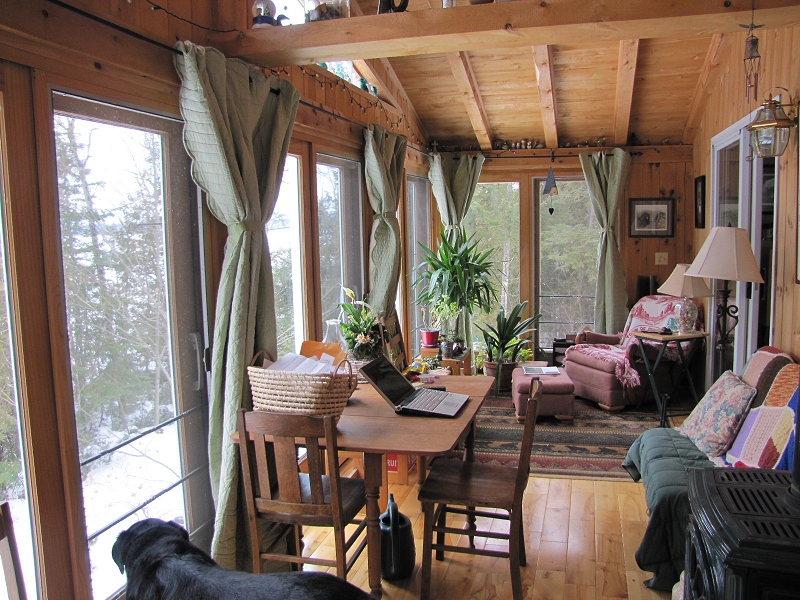 You're looking at my February project: putting window quilt drapes on the porch to keep cold out. They are open during the day and we get a lot of solar gain when it's sunny. They will be put away when winter is over. Opening them in the morning and closing them at night adds a ritual to the day. I like rituals. We are in a series of improvements actually. The standby generator is finally installed. This month we will tear out the carpeting in the bedrooms and put down the same Canadian birch that's in the rest of the house.