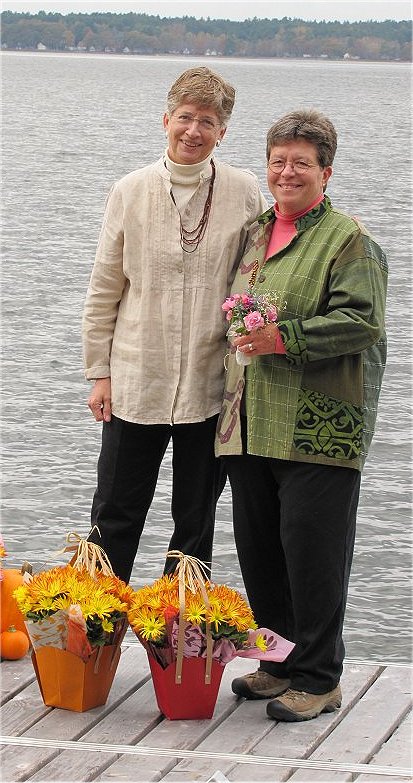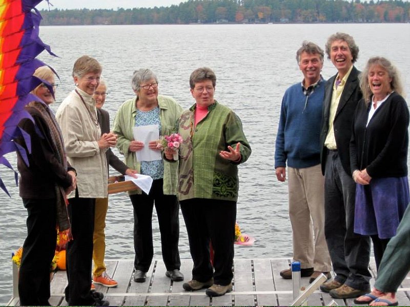Getting married turned out to be a lot of fun. It was a wonderful day. Sue Curra officiated and we did vows on our dock with as many best people that could fit and with folks on shore taking pictures. Decorations by autumn. After that we had a small celebration with food and drink at a lakeside park in town and did some simple contra dancing on the grass. My sister Colleen and neice Melanie came up from New Orleans and got to experience a slice of life in Unity. I think I heard a reference to Portlandia. We limited wedding planning to one week, making the arrangements in the car on the way to pick up the rings from Lisa Gent in Cape Elizabeth. Monica did the setup at the park. John McIntire led us in the dancing. Pat Allen held the ring tray and Nancy Lawrence was the flower girl. Mitch took photos. Our Commonground friends drove up from New Hampshire, Marge and Miff came from Southwest Haror and Lane came from Boston. Andi Bellerose got some good pictures of the dancing.