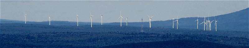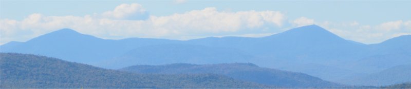 The ridge with the turbines can be just barely be seen from the top of Cadillac Mountain where I took the picture with 20x zoom and later upped the contrast. The turbines are over 40 miles away on Bull Hill in East Hancock. I can't believe that people who argued against them thought it would ruin the view from Cadillac. The mountains in the bottom shot are the western mountains seen from Robbins Hill lookout near Solon. We rode up there looking for fall color, but didn't find much.