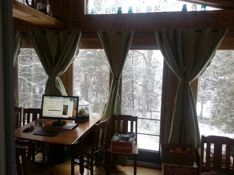 With the addition of an inexpensive 24 inch monitor and a bluetooth keyboard, I've made an upstairs workspace that lets me be in what I think of as the snow globe, this room that sticks out into the weather. My 13 inch ASUS ZenBook is fast and super portable, but the keyboard is crappy and I get tired of peering at the small screen. With a display port to HDMI adaptor, Melissa could hook up her Mac to it as well.