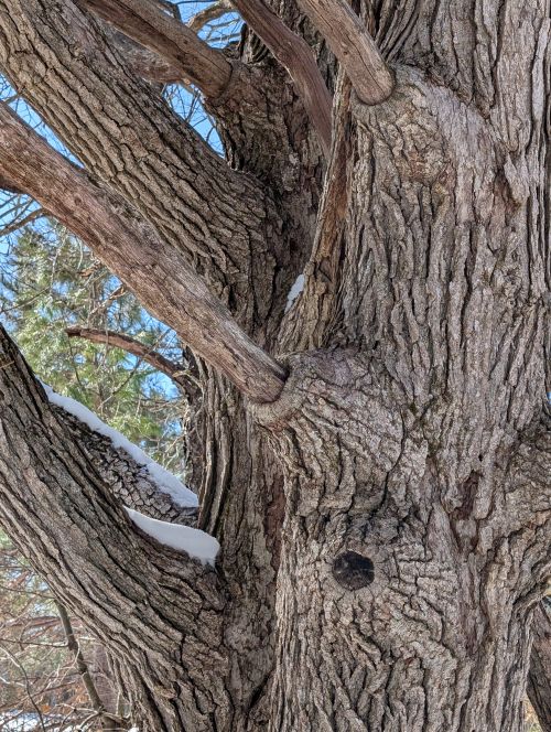 February has some brilliant light that ups the resolution and shows every wrinkle of an old tree on the bikeway trail which could use some packing down of the snow. Postholing, Melissa calls it when you sink several inches with each step. Not a comfortable gait.