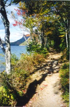 | Fall colors are falling and fading now. The first two weeks in October were peak. When the cyberpals were here we cruised down this path at Jordan Pond in Acadia. So many leaves, so little time.