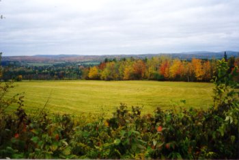 This past weekend, while taking Timmins to the eye doc eleventy-seven times (for a good time on a Saturday morning, try having your cornea scraped), I took some photos right through the windshield while old one-eye squinted and grabbed the wheel. You wouldn't believe how many times during the weekend, we stumbled into the unfortunate expression "keep your eyes peeled for" something or other. The best views of fall colors were from vantage points where you could see a whole hillside or valley. This pic is from the top of Quaker Hill, just across from the little cemetery/satellite dish cluster, where people in Unity go to commune directly with their ancestors. |