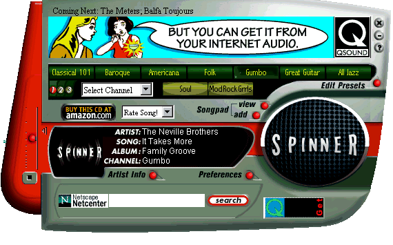 | Say what it is? Spinner is a little free program you can download at spinner.com. When you run it (and you're online) it streams audio to your computer. "Streams" means it plays it as it gets it. As they say at the spinner site, "Sure work sucks, but now you've got a sound track." There are a gazillion channels. I start off with Baroque in the morning and get funkier as the day goes on. It usually runs in the background while I'm working, and I flip to it only to identify something that's playing. Kind of a cool thing. Give it a try. | |