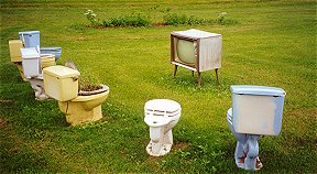 If there is a scale for these things, it probably goes (1)hokey, (2)fabulously hokey, (3)lawn art. The lawn art installation to the left is the art of Espo at Unity Pottery. It could be about TV, could be about plumbing, or it might just be about porcelain. Due to the fact that my sister Claudia goes to the bathroom a lot, we know that Espo has a degree in electrical engineering. Said degree hangs on the wall in the bathroom. After she returned from Nova Scotia last fall with facts and charts and maps of where the Bourgs lived in Nova Scotia, I thought she was a good researcher, but now I'm thinking maybe she just learns a lot from people's bathrooms.