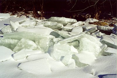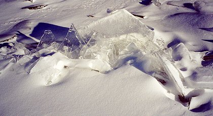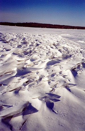 Scenes from our newly created 15 square mile back field. It happens a little different each year. Some wild weather with high winds broke up the ice in patches near the shore, tossed the pieces around, and then refroze as it was still tossing. A freeze frame from a movie that could be started up again, the world on pause. In some places thin sheets of ice standing perpendicular look like the windows of an abandoned eskimo house. With the snow sifted into the architecture like sand, it looks like the ruins of an ancient civilization. Maybe they called themselves the Glass People and their creation myth has them starting out as ice and turning into glass, a water to silicon transcendance. Maybe clarity was their highest virtue and albedo was their sacred word.