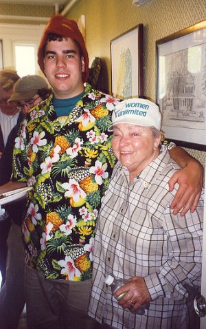 May graduations have kept us busy, first Unity College, then Colby. Colby is just discovering the Heron; our brochure is now in their mailings. Unity's graduation was much closer to heart and home. The families of Jeff McCabe and Sarah Colburn, two students we know well, filled up the house, and we hosted a party for the families of a few other graduates after the ceremony. The star of the weekend was Jeff's grandmother, Mary, a self-described "flaming liberal," union organizer, social justice activist who was once arrested with the Berrigans. Way cool. Jeff's parents, Sandy and Mike, are some of our favorite people. In this picture I particularly like the way the sprinkler system pipes appear to spring from Jeff's head.