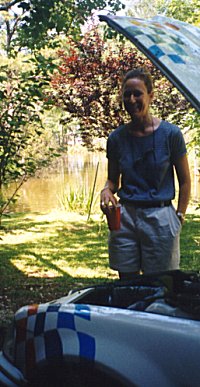 Kerry was showing some of us her new BMW racing car. We admired the rollbar on the inside and the complicated seat belts that look like parachute straps. Unfamiliar with racecar protocol, we forgot to ask to see the engine, but she proudly showed it to us. A big metal bar keeps the engine from flying out when it's doing a corner at a zillion mph. Hmmm. Owning a racecar. I've scanned through my world view and cannot locate the concept.