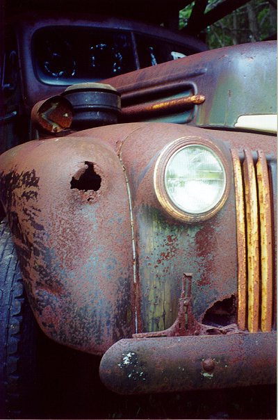 Our neighbor Bill has acquired another old truck. It doesn't run of course. That's not the point. The point is rust and character. Maybe rust is character, making first a pentimento of everything you've ever been, then bleeding all your histories together, and finally transcending color as the functional becomes organic. Through some trick of color, red brown rust suggests gold. I look closely for mica flecks and don't see any, but turning away I visually register the possibility of gold.