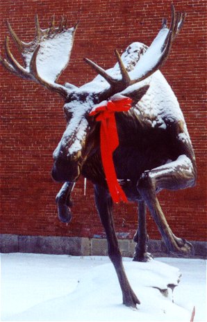 The moose to the left is on the corner by the Historical Society building; he's very useful for giving directions. Going to Belfast? Take a right at the moose. But he also seems ready to step out into the street. We could rig him with a motion detector light and scare folks coming thru town at night. We are having a great winter. It snows every few days and it seldom gets above freezing so we don't have melt and ice. Very satisfying to locals when things are as they should be. |