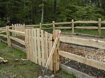 Our vegetable garden in Lacombe was called Center of the Universe. The new veggie garden we are building at the lake might be called the OK Corral, but it's dog proof. We got all our materials from a cedar mill in town, rough cut thick planks for the raised beds, cedar rail fencing, gates, compost bins, and mulch for the aisles. Unless there is a strong breeze, we wear bug suits to work outside; otherwise we'd be a mess of black fly bites.