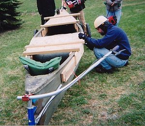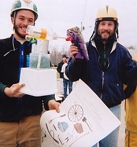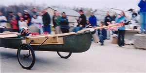 While we were away, the Earth Day Recycled Derby took place at Unity College, and our sponsored entry, the Copper Expresso, won the thing and set a new course record! We had an old fiberglass canoe in our garden shed, student Steve Aegis got the wheels from an old sulky in a field by Land Rover Man's house. Another student Aaron was the chief engineer, adding a rudder and bicycle brakes connected to a single wheel on the rear, and some top decking to hold the fiberglass together in the event of a crash. Two other students, Morgan and her roommate, were also on the team. You are looking at Yankee ingenuity here. Looking forward to seeing the video of their run. Thanks to Donna for photos of the event.