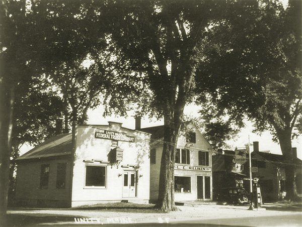 Our friend Arlene found this old postcard picture in the Historical Society's collection. The elms were glorious, but are all gone now. Good timing on the find, because we're getting ready to paint, or rather stain, the building (in the middle with the gas pump in front). I was thinking about that just now as I walked past a small throw rug we just bought last night. Here's a swatch from the rug. I think we should paint the building these colors. That earthy tan has been suggesting itself for some time. Melissa says it's baby poop brown, but maybe baby poop is a rich earthy color.