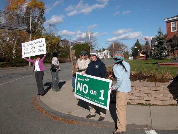 Election Day was Tuesday and Maine was voting on a referendum concocted by a mean-spirited group called the Christian Civic League to toss out a law passed by the legislature this year that added "sexual orientation" to it's non-discrimination law. The referendum was defeated 55 to 45 percent. It's a real victory for Maine; this time the mainstream Protestant churches spoke out in defense of civil rights for all. They are starting to realize that if they are silent, the right-wing crazies will appear to speak for all Christians. Our fearless leader Tess, whose mother was gay, organized this little demonstration at noon on Election Day. Other towns have their bridges where they demonstrate; we have the corner with the moose. It is required that at least one sign be made with duct tape. I think we'll be doing this more often. In Unity the vote was 308 Yes to 310 No. We need to have friendly discussions with people of the Republican persuasion, instead of respecting their views silently.