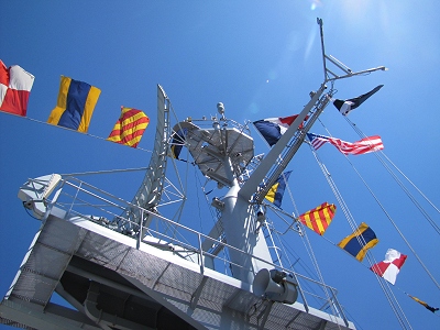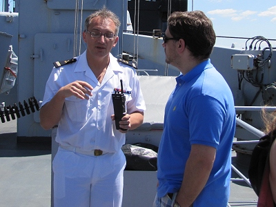 | It's navy week in NOLA although people seemed to be dressed in the usual array of colors. Luc, our sweet French nephew-in-law, invited us to tour the French frigate Germinal and he served as interpreter. I understand enough French to know that in this photo he is saying, "Wake up, Captain, it's show time." Afterwards in the tiny courtyard of El Gato Negro I had the best veggie taco ever. |