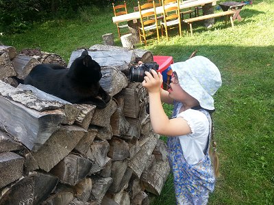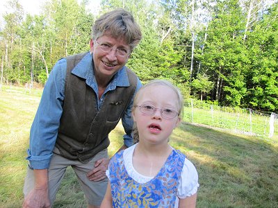 | On Labor Day we went to a boil-some-corn-and-eat-outside pot luck at Beth,Jaime, and Laurel's house. I let Laurel use my camera. The adults all had the instinct to bend down and stare into the camera; this got us some goofy parallax effects. Hazel took the picture of Laurel and me. |
